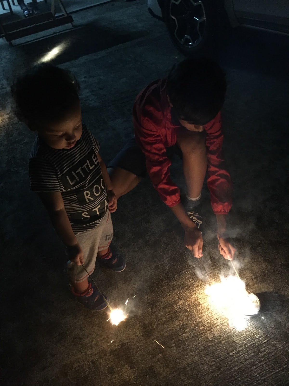 Вечером мы пускали фейерверк. Дедушка знает, чем занять внуков. На голове у мальчишек фонарики.